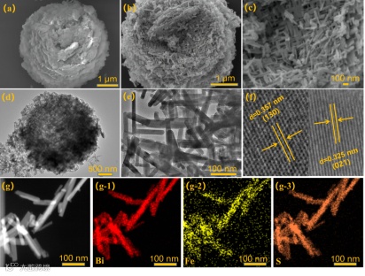 图2:FeBi-MOF-50% (a), FeBiS-50% (b and c)的扫描电镜图像;FeBiS-50%的(d)透射电镜、(e 和 f)高分辨图像和(g)TEM-Mapping 图像。