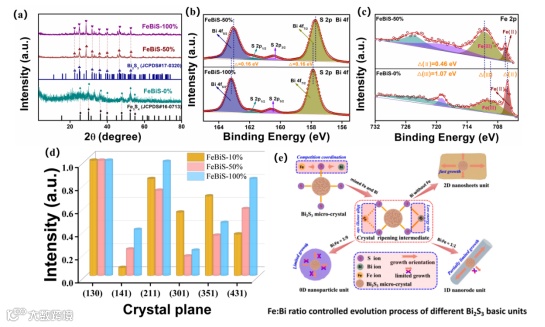 图4:(a) FeBiS-0%、FeBiS-50%、FeBiS-100%以及Fe3S4和Bi2S3的标准卡的XRD谱图;(b) FeBiS-50%和FeBiS-100%的S 2p轨道和Bi 4f轨道的高分辨XPS谱图;(c) FeBiS-50%和FeBiS-0%的Fe 2p轨道的高分辨XPS光谱;(d) FeBiS-10%、FeBiS-50%、FeBiS-100%样品不同晶面的归一化XRD峰面积比(内标:(130)衍射面);(e) Fe:Bi比值控制不同Bi2S3基构单元的演化过程。