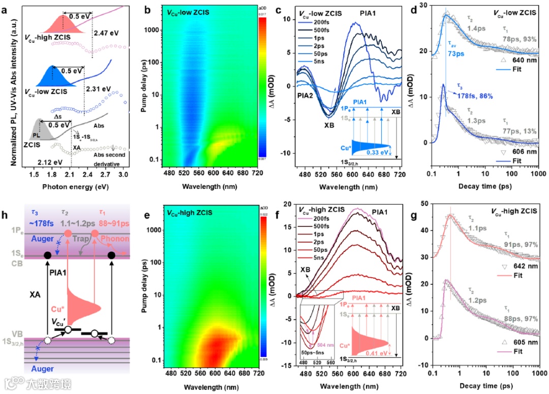 图3. 量子点的光谱表征。(a)不同量子点的稳态PL发射(阴影)、UV-Vis吸收(实线)以及UV-Vis吸收的二次微分曲线(点线)。(b-d)VCu-low ZCIS量子点的瞬态吸收三维等高线图,二维曲线以及PIA1吸收衰减及拟合曲线。(e-g)VCu-high ZCIS量子点的瞬态吸收三维等高线图,二维曲线以及PIA1吸收衰减及拟合曲线。(h)VCu-high ZCIS量子点的光生电荷转移动力学示意图。