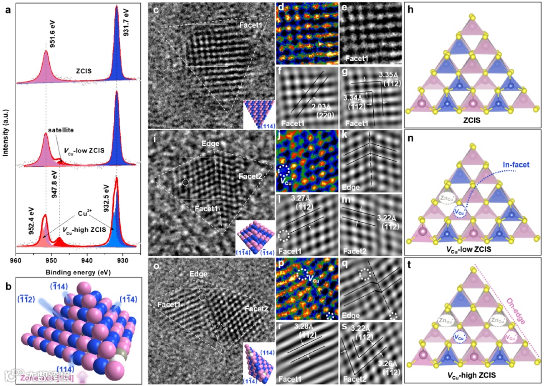 XPS数据表明无缺陷的ZCIS量子点中的Cu为一价Cu+,而缺铜量子点中则出现了逐渐明显的二价Cu2+成分;EPR分析也证明了VCu′的浓度在逐渐增加。单颗粒VCu-low ZCIS量子点的HRTEM图像显示在其(1-14)晶面中,观察到模糊的晶格像,这暗示在其面内存在空位缺陷;而对于单颗粒VCu-high ZCIS量子点的HRTEM图像,显示在其(1-14)和(114)晶面中,均能观察到模糊的晶格像,这暗示其空位缺陷增加;并且逆FFT图像展示了(1-14)和(114)两个相交的暴露晶面存在位错的边缘,反映空位缺陷的晶格像也主要存在于边缘上。以上结果说明缺铜的ZCIS量子点中存在空位缺陷:当空位缺陷浓度低时,缺陷优先存在于暴露晶面的面内,当空位缺陷浓度升高时,缺陷会在暴露晶面的面内和边缘共存。