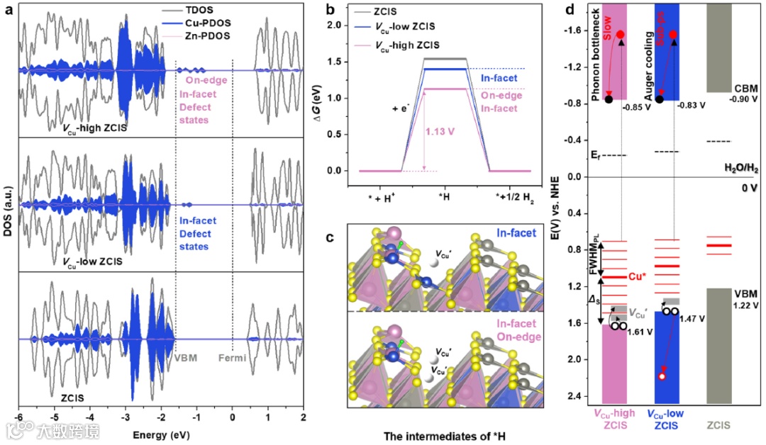 图4. DFT模拟和能带结构。ZCIS、VCu-low ZCIS和VCu-high ZCIS量子点的(a)态密度分布。(b)光催化制氢过程的吉布斯自由能变化。(c)质子还原反应关键构型。(d)能带结构。