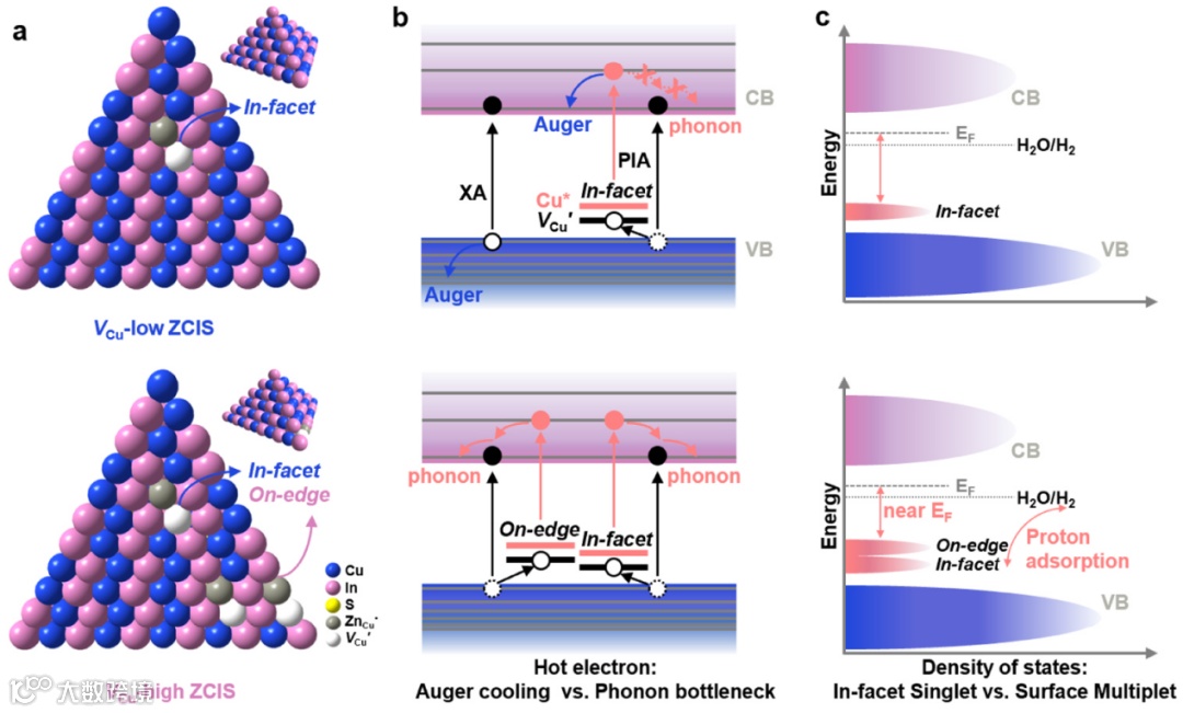 图1. VCu-low ZCIS量子点和VCu-high ZCIS量子点的(a)表面缺陷态示意图;(b)光学机理差异性对比;(c)催化制氢机制差异性对比