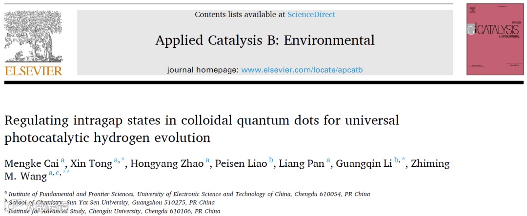 近日,来自电子科技大学的童鑫/王志明课题组联合中山大学李光琴课题组,在国际知名期刊Applied Catalysis B: Environmental上发表题为“Regulating intragap states in colloidal quantum dots for universal photocatalytic hydrogen evolution”的研究文章。该文章详细研究了Zn-doped CuInS2(ZCIS)胶体量子点的表面缺陷带内态,通过对一系列缺铜的ZCIS胶体量子点进行结构和光谱表征,结合模拟计算发现:(ⅰ)VCu′空位和高价Cu*缺陷对存在于缺铜ZCIS胶体量子点表面;(ⅱ)VCu′缺陷能够捕获价带空穴从而解耦电子-空穴对,抑制热电子超快的俄歇冷却;(ⅲ)靠近费米能级的高价Cu*缺陷作为光激活的光诱导吸收中心能够产生额外的光生电子,且由于量子点中的声子瓶颈效应,电子弛豫寿命得到延长;(ⅳ)边缘的缺陷对相比面内的缺陷对作为质子还原的反应位点,表现出更优异的反应动力学性能。