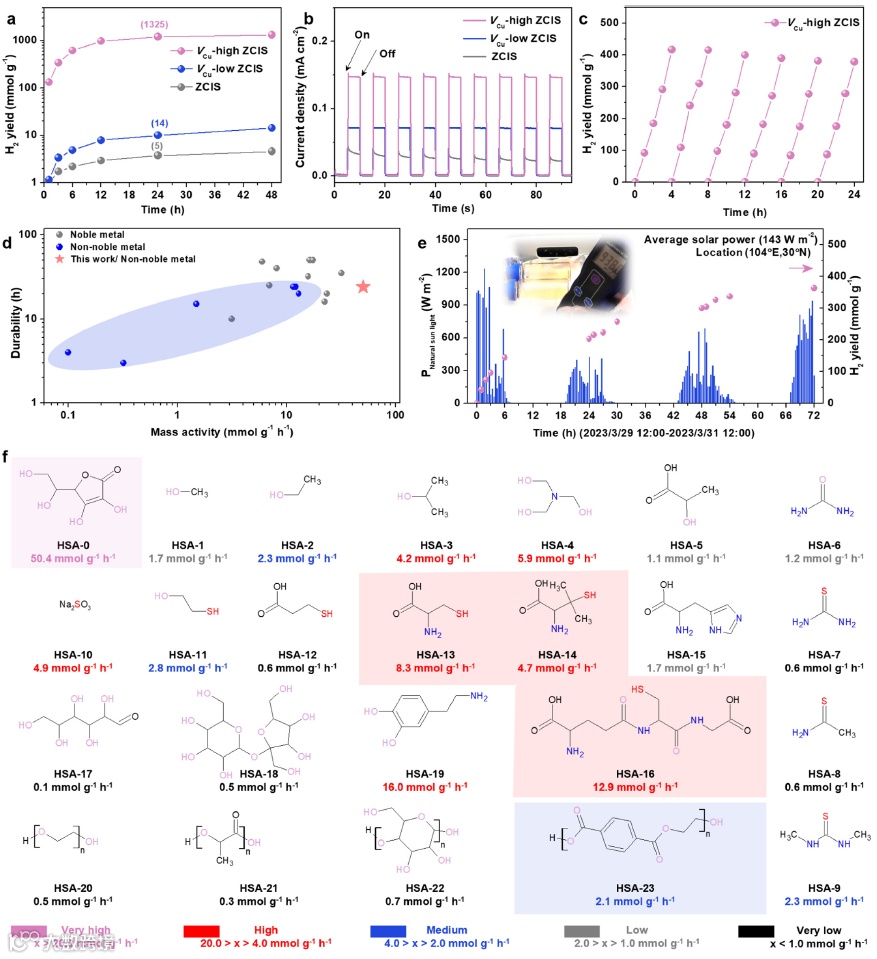 图5. 光催化制氢性能。ZCIS、VCu-low ZCIS和VCu-high ZCIS量子点的(a)光催化制氢性能对比。(b)在AM 1.5G间歇光照条件下的J-t曲线。(c)24 h的循环测试。(d)光催化制氢的活性及稳定性比较。(e)太阳光驱动下VCu-high ZCIS量子点连续三天光催化制氢的性能。