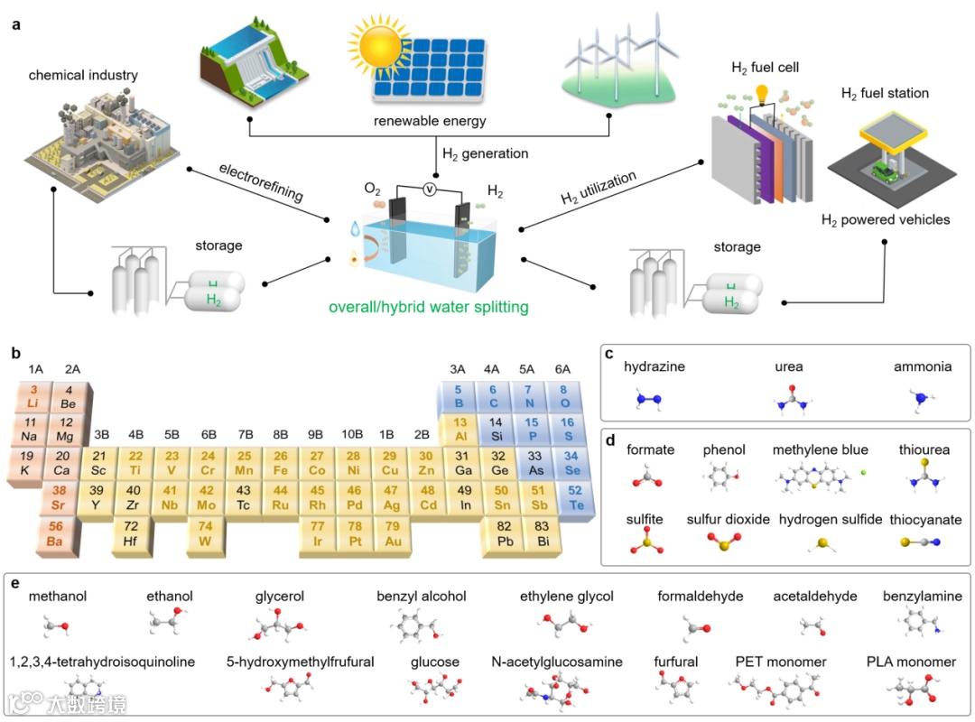 图1. (a) 绿氢循环示意图;(b) 双功能电催化剂中所涉及的元素组成。(c-e) 复合水分解中阳极替代反应所涉及的小分子结构。