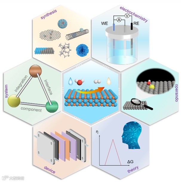 5. 双功能电催化剂在实验室中的高活性并不保证其在最终系统中的卓越表现,这是因为在放大反应中会面临水/热管理、物质转移和设备组装等新挑战。从基础研究到工业应用需深入探索,特别是要在系统水平对催化剂性能以及集成组分进行评估。