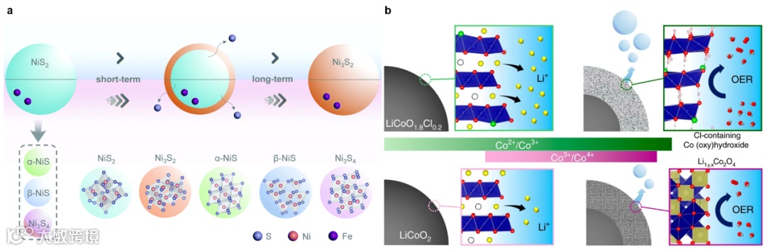 图2. (a) NiS2在HER过程中的重构;(b) LiCoO1-xOx在OER过程中的重构。