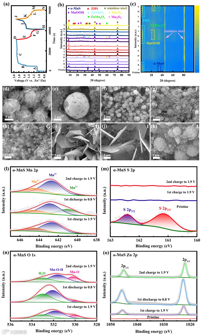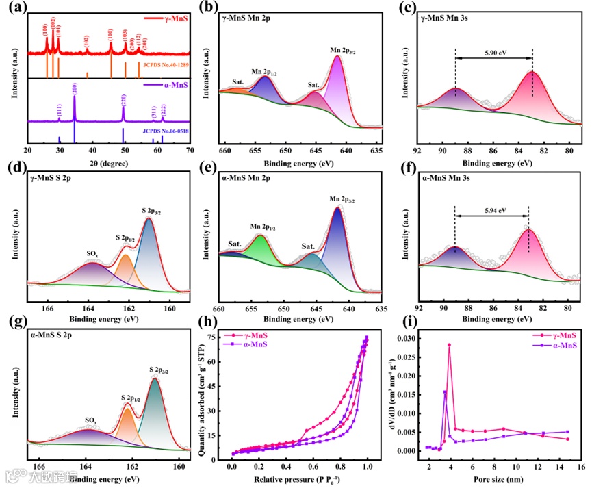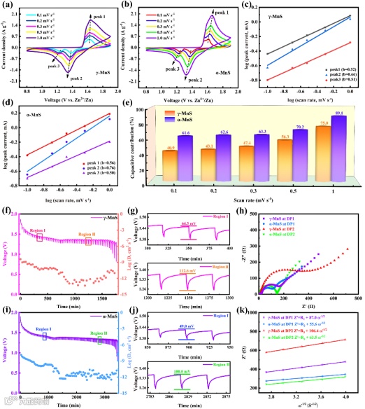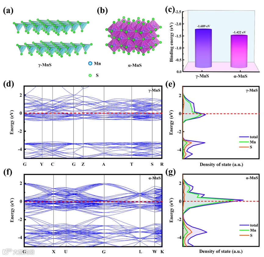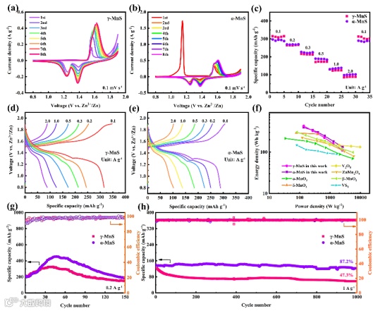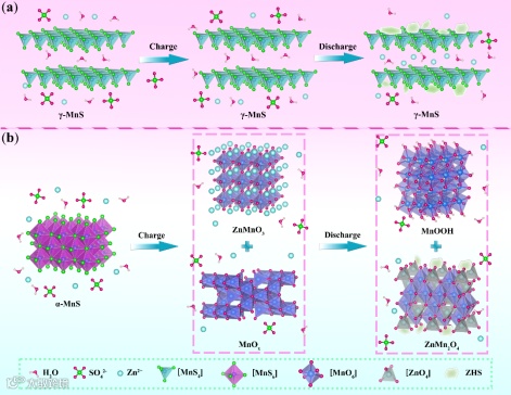鉴于此,湖南工业大学朱裔荣教授和中南大学邹国强副教授等人在密度函数理论(DFT)计算的启发下,首次设计合成了具有不同晶型的γ-MnS和α-MnS空心微球,并将其作为AZIBs的正极材料,获得显著不同的储能机制。值得注意的是,γ-MnS电极在整个充放电过程中都能稳定存在并存储能量,而α-MnS电极在初始充电过程中首先发生不可逆的原位氧化生成ZnMnO3/MnOx,然后在随后的充放电过程中发生可逆的H+/Zn2+共嵌入/脱出的储能行为。这种由原位电化学氧化引起的独特相变机制使α-MnS电极实现了增强的离子扩散动力学,从而提高了倍率性能和循环稳定性。这项研究不仅丰富了锰基硫化物正极的储能机理,而且为先进锰基正极材料的设计和开发提供了研究思路。