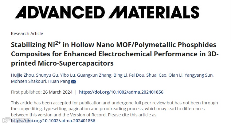 近日,来自扬州大学的庞欢教授,在国际知名期刊Advanced Materials上发表题为“Stabilizing Ni2+ in Hollow Nano MOF/Polymetallic Phosphides Composites for Enhanced Electrochemical Performance in 3D-printed Micro-Supercapacitors”的观点文章。该研究论文合成了可打印结构稳定空心纳米MOF复合材料,研究了温度、煅烧气体和金属掺杂对纳米-MOF复合材料形态的影响。以中空纳米VZNP复合材料作为正极活性材料构建的MSC表现出较高的比电容。这种方法通过多价金属掺杂和煅烧来合成双金属磷化物复合材料,有效增强了通过煅烧和磷化生成的纳米MOF复合材料在氧化还原反应过程中的结构稳定性。这种方法推动了多功能纳米MOF电极材料的构建,并增强了其在先进应用中的潜力。