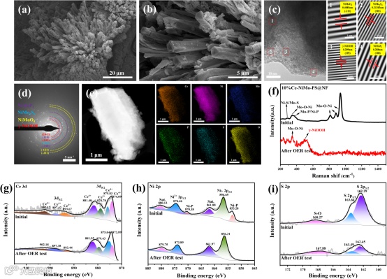 图 5. OER长期稳定性测试后10%Ce-NiMo-PS@NF的形貌和化学成分表征。