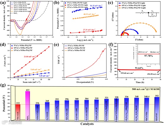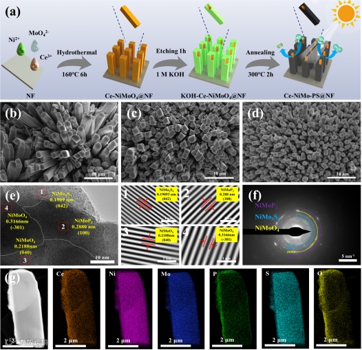 图1. Ce-NiMo-PS@NF的合成过程示意图以及催化剂的形貌结构和内在活性表征。
