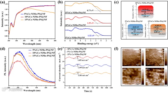 由于Ce具有未完全填充的4f轨道和较低的电负性,它在过渡金属基材料的光电化学邻域中引起了越来越多的关注。在过渡金属基材料中引入Ce元素可以改变电催化剂中过渡金属原子的电子环境,从而提高电催化活性。据报道,有研究工作者通过电沉积和磷化工艺,在高电流密度下构建了用于氢析出反应(HER)的Ce0.2-CoP/Ni3P@NF异质结构电催化剂。由于Ce掺杂和CoP/Ni3P异质界面的协同活化,提高了电子传导性,降低了水分解动力学的能垒,因此在1000 mA cm-2电流密度下过电位仅为225 mV。同样,有研究工作者成功制备了自支撑N和Ce双掺杂NiCoP纳米阵列。在电流密度为10 mA cm-2时,HER和氧析出反应(OER)的过电位分别为78 mV和212 mV,并且具有良好的长期运行稳定性,这表明掺杂N和Ce 能显著改变NiCoP的电子结构,从而优化HER/OER中间体的吉布斯自由能。众所周知,稀土元素掺杂有助于改变晶体结构,从而有效调整能带位置,改善光吸收范围。因此,掺杂Ce不仅是提高电催化活性的有效策略,而且会显著影响其光吸收能力。Ce具有显著的光生电荷捕获能力,可促进载流子分离和转移。然而,掺杂Ce的多相镍钼基磷/硫化异质结构仍有待开发,掺杂Ce对磷/硫化异质结构光增强电催化活性的影响也有待阐明。