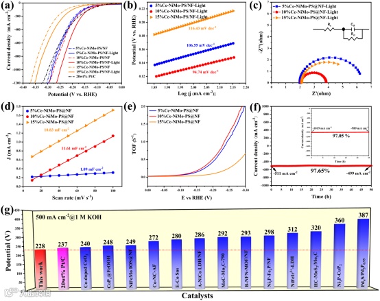 亮点二:在光增强条件下,10%Ce-NiMo-PS@NF具有显著的高电流密度电催化性能。