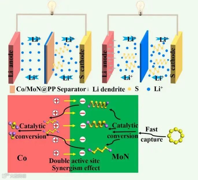 图1. Co/MoN抑制多硫化物穿梭和调控Li离子传输示意图,以及Co与MoN不同功能微区协同作用的描述图。