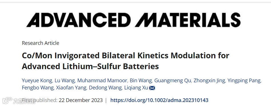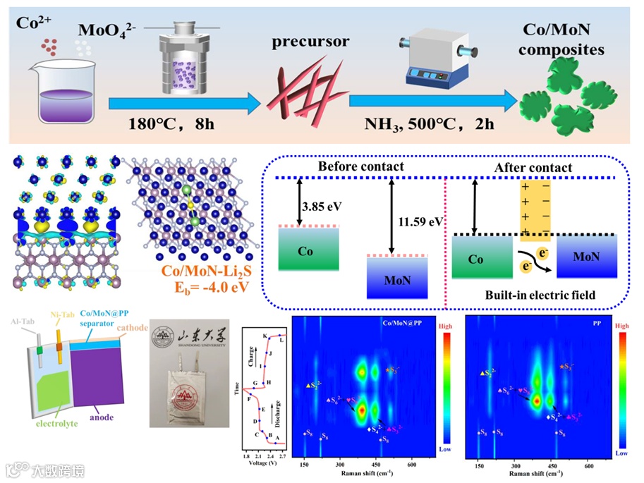 近日,来自山东大学的徐立强教授,在国际知名期刊Advanced Materials上发表题为“Co/MoN Invigorated Bilateral Kinetics Modulation for Advanced Lithium–Sulfur Batteries”的文章,该论文的第一作者是硕士生孔月月。该文章研究了具有不同功能微区的Co/MoN复合材料的协同效应,同时有效解决了锂硫电池中硫正极缓慢的硫反应动力学和锂负极锂枝晶、死锂等问题。该项研究通过异质结构的构建以探索提高MoN在锂硫电池中吸附活性和催化活性的策略,还研究了催化剂结构与电池性能之间的关系,为理解锂硫电池中具有不同功能微区异质结构催化剂的构建和应用探索提供了新思路和新途径。
