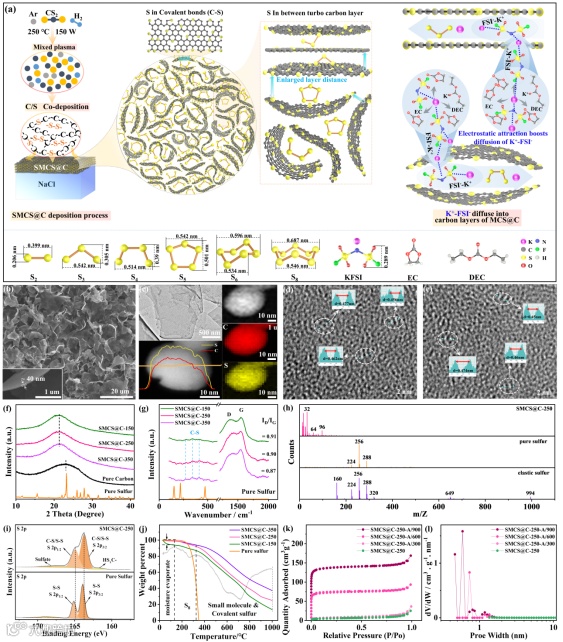 首先,改工作通过一步C/S共沉积策略合成了涡轮碳层限域的小分子/共价硫(SMCS@C)正极,其中SMCS含量高达~74.1 wt%。在典型的合成过程中(图1a),前驱体分解成高活性的C,S混合等离子体,并共沉积在氯化钠表面,形成SMCS@C。共沉积过程显著增强了小硫分子和共价硫(-C-S-C-)在碳层中的分散和约束,这使硫的稳定性大大增强,同时被包裹的硫又扩大了涡轮碳层空间。这为阴离子-阳离子对(K+ -FSI-)向碳层中的扩散及原位调控硫转化反应提供可能性,促进了双平台固态S转化的形成,优化了K-S电池的电压和速率能力。