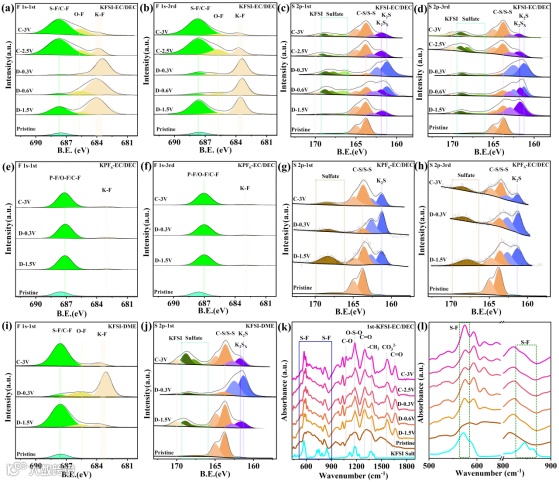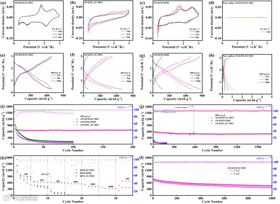 这个结果初步证明FSI-阴离子对于KFSI-EC/DEC电解液中的新型硫转化的形成起到关键作用。至于KFSI-DME电解液(图2c),其CV曲线的峰位置与KFSI-EC/DEC电解液中的峰位置保持一致,进一步证明了在KFSI-EC/DEC中决定双平台硫转化化学反应的是FSI-阴离子而不是溶剂。此外,还使用纯硫粉作为阴极,在KFSI-EC/DEC电解质中进行测试。如图2d所示的CV曲线只有在第一个循环中出现一个尖锐的阴极峰,位于约2.1 V,这归因于亲核反应,在之后的循环中该峰彻底消失,表明多硫化物与EC/DEC之间的不可逆亲核反应完全使硫阴极失活。因此,硫的形态、阴离子及其之间的匹配关系对于双平台硫转化化学反应至关重要。