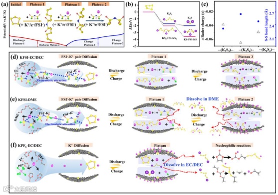 SMCS@C正极与KFSI-EC/DEC电解液匹配良好。首先,SMCS@C较大的碳层空间使得K+- FSI-离子对向碳层内的扩散成为可能,其次K+ 与 FSI- 之间的库伦引力加速了离子对的扩散。进一步的,在碳层内部,多硫化物(K2Sn)一旦生成即与FSI-原位结合,这是因为然后经历一个双平台反应路径,Sx + K++ e- + FSI- → KSx-KSI-SxK + KF (2.0-2.5 V)和KSn-KSI-SnK (2≤n≤3) + K+ + e- + FSI-→ KS-KSI-SK + KF (1.2-2.0V),硫转化过程是一个高度可逆的双平台固相反应。计算表明,这种新型的硫转化化学反应使得中间产物(KSn-KSI-SnK)的自由能较低,且其S-S键较弱,从而实现了更快更高效的硫转化。