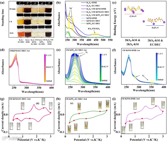为了探索SMCS@C与KFSI-EC/DEC配对时的新型双平台硫转化机制,使用原位紫外-可见(UV-Vis)光谱和比色实验对电解液的演化进行了分析。图3d给出了循环的KFSI-EC/DEC电解液的原位UV-Vis光谱;未观察到Sn2-信号,整个循环过程中电解质保持无色(图3g),表明无可溶性多硫化物中间体的产生。另外,FSI-的峰强度在放电过程中首先减小,然后趋于稳定。这是因为FSI-阴离子可能以K+-FSI−离子对的形式扩散到SMCS@C阴极的涡轮状碳层内,然后在原位参与硫转化,并在随后的充放电过程中保持在内部。基于KFSI-DME/KPF6-EC/DEC的电池(图3e,f)表现出明显的穿梭效应。