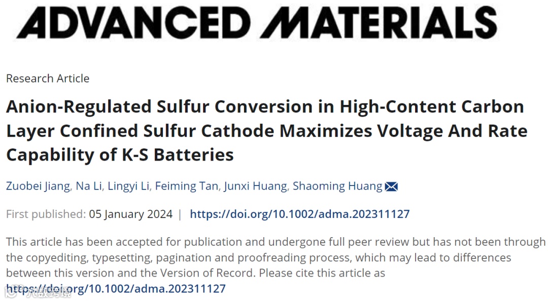 Zuobei Jiang, Na Li*, Lingyi Li, Feiming Tan, Junxi Huang, Shaoming Huang*,Anion-Regulated Sulfur Conversion in High-Content Carbon Layer Confined Sulfur Cathode Maximizes Voltage And Rate Capability of K-S Batteries,DOI:10.1002/adma.202311127