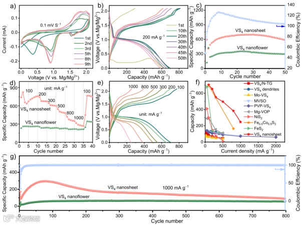 所合成的VS4正极材料表现出显著优异的电化学储镁性能,其在200mA g-1的电流密度下的储镁容量为701 mAh g-1,在1.0 A/g电流密度下也表现出超过600个循环的长期工作稳定性,每个循环的容量衰减仅为0.3 %。