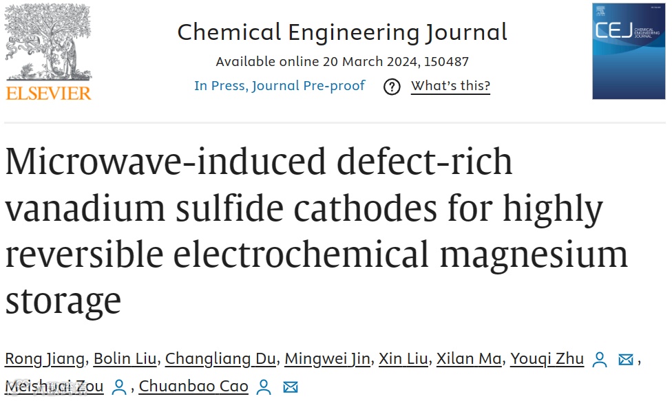 近日,来自北京理工大学的曹传宝教授和朱有启副教授等在国际知名期刊Chemical Engineering Journal上发表题为“Microwave-induced defect-rich vanadium sulfide cathodes for highly reversible electrochemical magnesium storage”的研究论文。本工作以富缺陷的VS4材料作为正极材料模型,提出了一种微波诱导合成方法,制备了具有丰富硫空位和高V3+/V4+比的VS4纳米片。电化学反应动力学的改善归因于VS4纳米片的富缺陷结构和S2−/S22−之间的可逆阴离子氧化还原反应。为设计具有良好扩散动力学的高性能Mg2+离子存储阴极材料提供了更深层次的理解。