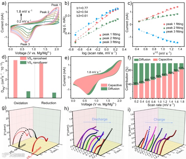 图4. 富缺陷VS4纳米片的电化学反应动力学。(a) CV曲线。(b)和(c)对应的线性关系。(d)计算Mg2+离子扩散系数。(e)、(f)伪电容和电容贡献率。(g)、(h)和(i)循环前和激活15个循环后不同充放电电压下的EIS光谱。