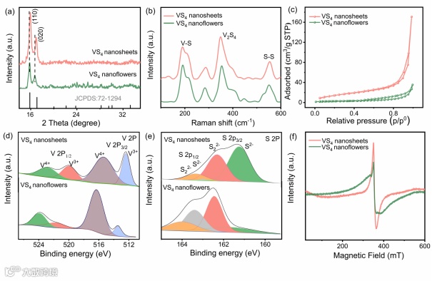 图2. 富缺陷VS4纳米片的化学和成分表征。(a) XRD图谱。(b)拉曼光谱。(c) N2吸附-解吸等温线。(d)和(e)高分辨率XPS V 2p和S 2p光谱。(f) EPR谱。
