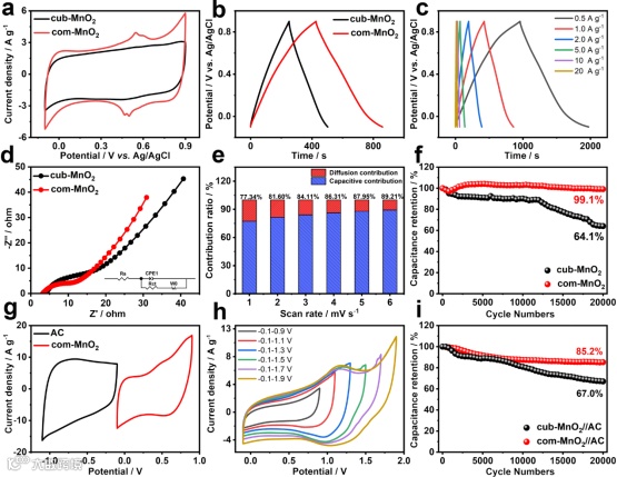 com-MnO2具有提升的循环稳定性,其99.1%的容量保留率,优于cub-MnO2的64.1%,表明com-MnO2伴随压缩的[MnO6]增强了可逆Na+存储性能。