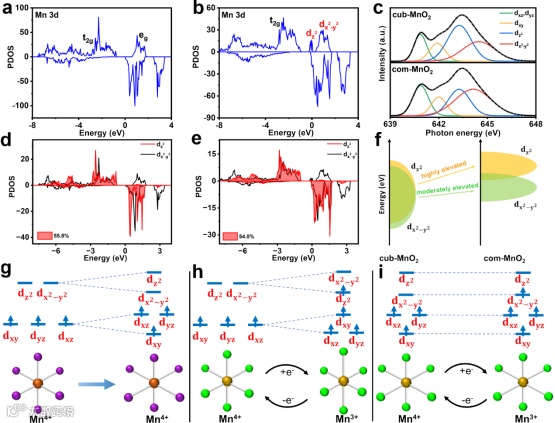 DFT计算证实了能级分裂,Mn 3d轨道简并的消除。对于com-MnO2,由于Mn 3d轨道非简并,Mn4+还原过程中新接受的电子更倾向于占据能级相对较低的dx2-y2轨道,简并基态的消除避免了J-T畸变的发生(图5i),有助于提高钠的插入/提取的可逆性
