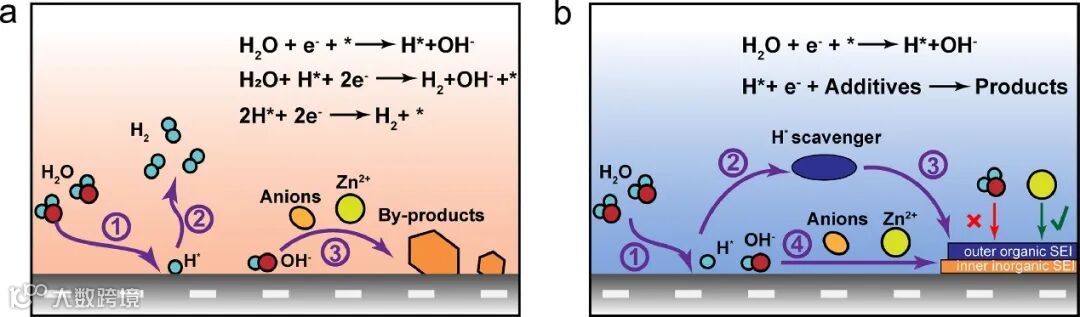 水系锌离子电池由于其低成本,高安全性及高体积能量密度等优点被视为一种极具前景的大规模储能技术。然而,锌金属负极的稳定性一直是锌离子电池商用化的重大挑战之一。严重降低锌负极稳定性的罪魁祸首之一在水系电解液中由于析氢反应生成的碱式硫酸锌等副产物,它会造成锌负极界面电子及离子分布不均,从而诱导枝晶生成。