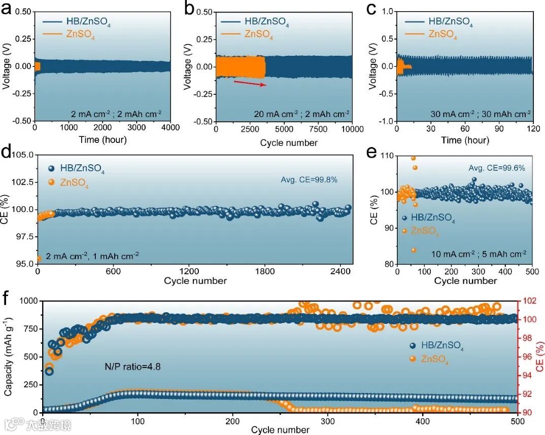 锌负极循环稳定性表征:a-c)锌对称电池循环寿命对比,d-e)锌铜半电池循环寿命对比,f)锌-五氧化二钒全电池循环寿命对比