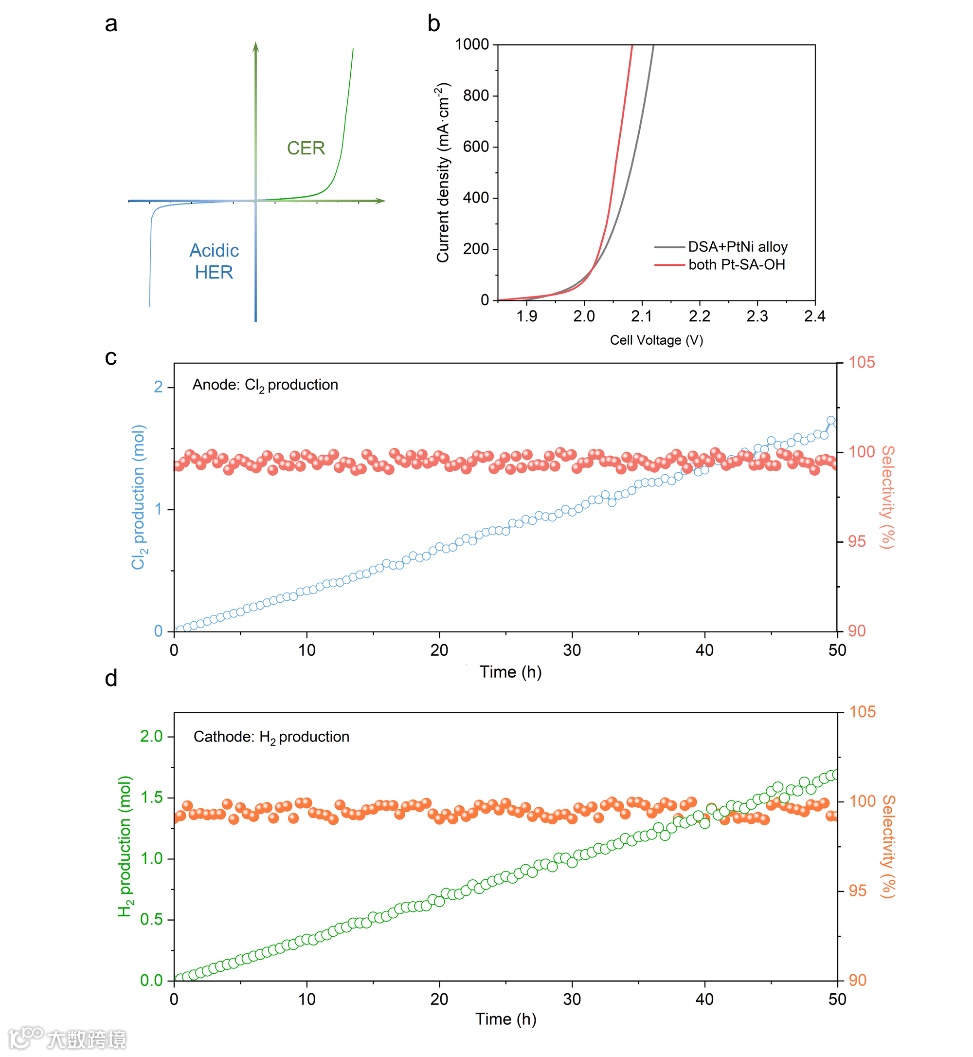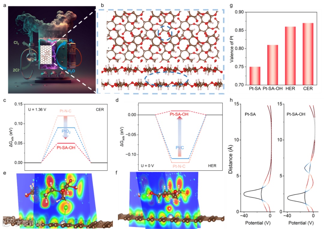 在电化学测试中,Pt-SA-OH在HER和CER中分别实现了10 mA·cm-2下的21 mV和20 mV的过电位。此外,它表现出31802和501624 A g-1的质量活性,远高于商业催化剂。此外,Pt-SA-OH在反应中显示出较高的电子转移能力,在HER和CER中,当电位分别为0 V vs. RHE和1.3 V vs. NHE时,电荷转移电阻显著减小。这些结果共同证明了Pt-SA-OH的高双功能效率。Pt-SA-OH表现出27 mV·dec-1的最低Tafel斜率,以及对HER的1.6 Ω的电荷转移电阻(Rct)。同样,在CER中显示了1.3 Ω的最低Rct和99.7%的最高选择性。在长期测试中,Pt-SA-OH在HER和CER期间只显示出轻微的衰减,展示了在实际应用中具有良好前景。