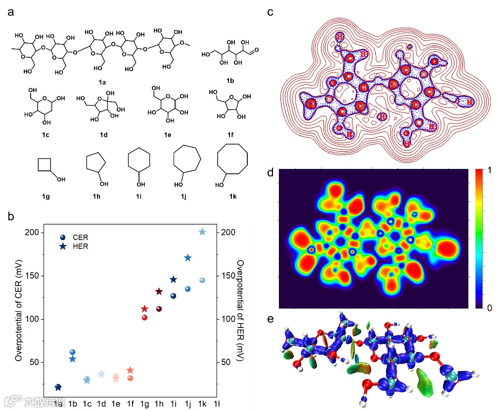 为了满足实际应用的高要求,我们还进行了双电极测试,当Pt-SA-OH应用到两个电极上的时候,整个催化体系展现出高于商业催化剂的效率和产物产量,的都展现出显著的催化效率。在电化学效率评估之后,仍然需要进一步理解有机催化剂的作用以及有机催化剂影响催化效率的关键性质。因此,我们选择了各种羟基化合物(OH)负载到Pt SAS上。环状形状的羟基显示出相对较高的活性,这可能是因为环状分子更容易自组装成反应物通道。但随着环数的增加,活性逐渐下降,这可能是由于较大环的空间位阻效应。羟基团也是形成非共价相互作用的重要因素,例如静电相互作用和氢键相互作用。以纤维素为例,正如IRI结果所示,原子之间有许多绿色区域,归因于弱的分子内相互作用的形成。在负载到SAS上后,羟基化合物自组装成通道并加速反应。