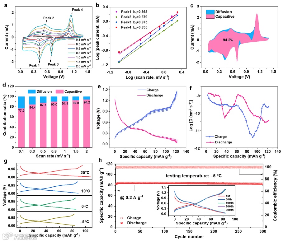 对HOP电极材料的氧化还原反应动力学进行了研究。在CV曲线中, HOP电极的氧化还原峰呈对称分布,表明电极具有良好的电化学可逆性。通过对不同扫描速率的CV曲线计算,得到图3d,可以看出HOP电极的反应过程主要由表面电容行为控制,伴随较弱离子扩散控制行为,电容反应贡献的容量随着扫描速率的增加逐渐增多。同时,通过GITT测试计算出HOP电极具有较高的离子扩散系数,在-5℃时也有优异的循环稳定性。