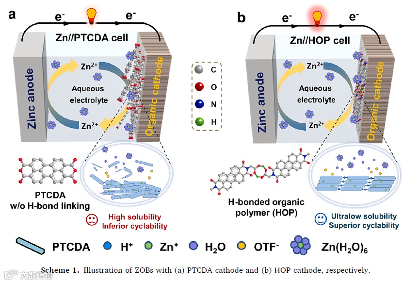 有机电极材料相比无机电极材料具有成本低、原料可得性广、环境友好等优点,符合可持续发展的要求。此外,有机材料还提供了可控的结构设计、可调的氧化还原电压和丰富的电化学活性位点。因此,水系锌有机电池(ZOBs)因其结构适应性强和固有的安全性被受到广泛关注。然而有机电极在络合载流子(金属离子或电解质阴离子)后极性增加,易在水溶液中溶解,面临着循环稳定性差的问题。