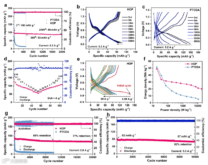 HOP电极的化学结构非常稳定,在50 A g-1的超大电流密度下,也可以拥有60 mAh g-1的可逆容量。此外,在2A g-1的电流密度下循环20000次,拥有接近80%的容量保留率和100%的库伦效率,这表明HOP电极在长期循环过程中保持了高度可逆的氧化还原活性。