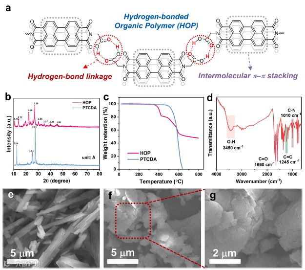 本文通过非共价超分子自组装策略合成了一种氢键连接的有机聚合物(HOP),分子结构如图1a所示。HOP在26°附近有一个宽峰,在10.7°、14°、22.3°和27.2°处有几个特征峰,晶面间距在1.99 ~ 8.19 Å之间,是一种半结晶聚合物。并且具有较高的热稳定性,氢键自组装后形貌呈片状。