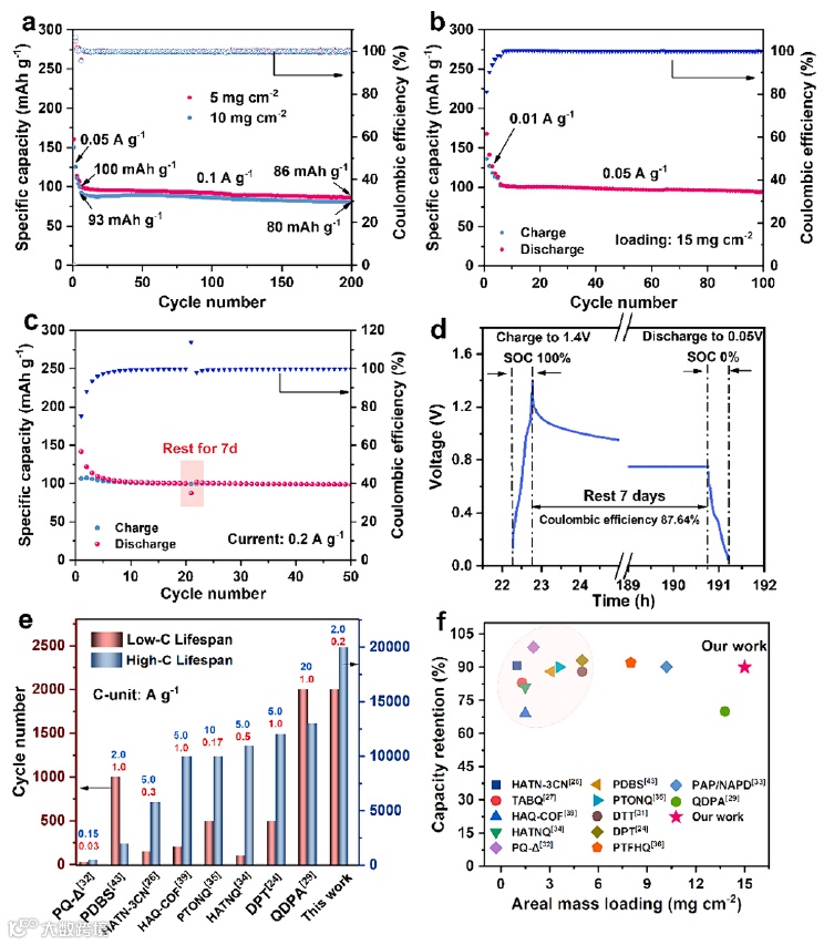 为了进一步研究HOP电极的实用性,我们进行了高负载和自放电测试。HOP//Zn电池在15mg cm-2的高负载下仍然能稳定循环100圈,与最近报道的其他高负载的工作相比,表现出卓越的优越性。在自放电测试中,电池静置7天后的放电容量为87.6 mAh g-1,其容量衰减率仅有12.4%(静置前的放电容量为100 mAh g-1),在之后一圈的循环中,电池的放电容量又恢复到100 mAh g-1,这种卓越的可恢复性对于长时间充电和放电间隔的大型静态储能设备至关重要。