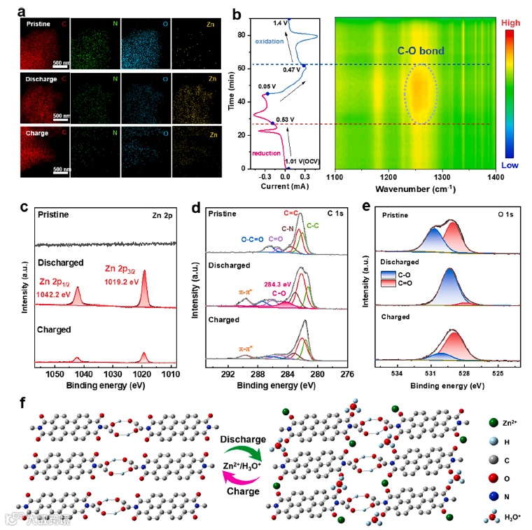 通过XPS对不同电位下的HOP电极不同元素的化学状态进行表征。在高分辨率C1s光谱中,当从初始状态完全放电到0.05V时,C=O峰逐渐减小,并在充电过程中逐渐增强,在O1s光谱中也出现同样的趋势,这说明在放电过程中,C=O键接收电子并与电解质阳离子(如Zn2+和H3O+)形成配位键,充电过程中电解质阳离子解离,C=O键再生,这也与原位红外结果高度一致。