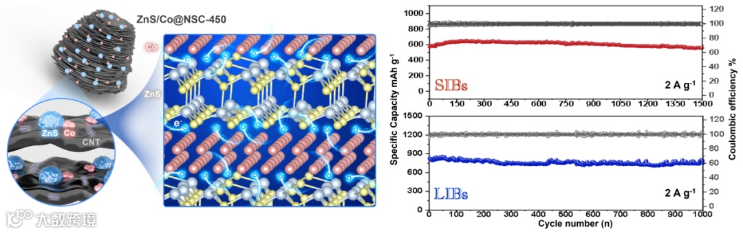摘要图. 设计了一种嵌入“松果”状N/S共掺杂碳基质中的纳米级ZnS/Co异质结构用于高倍率及长期钠/锂离子存储。