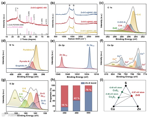 图2. (a) ZnS/Co@NSC-450的 XRD衍射图。(b) 3个ZnS/Co@NSC样品的拉曼光谱。ZnS/Co@NSC-450的(c) C 1s、(d) N 1s、(e) Zn 2p、(f) Co 2p和(g) S 2p 的XPS光谱。(h) 3个ZnS/Co@NSC样品的S 2p光谱中Zn-S键的含量百分比。(i) Zn和Co与S的反应能(Erxn)。