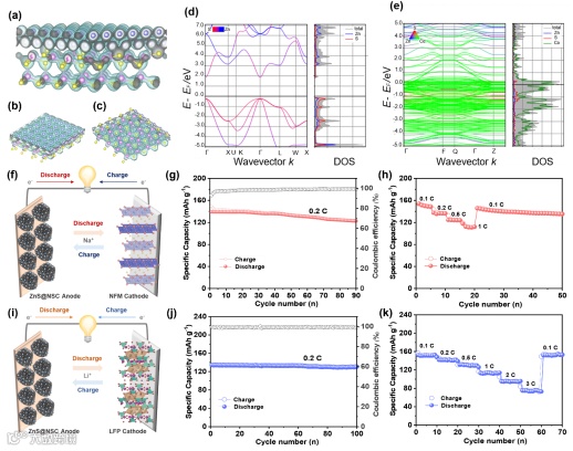 图5. 来自(a)侧面、(b)顶部和(c)底部的ZnS/Co异质结的电荷密度差示意图。计算的(d)ZnS和(e) ZnS/Co异质结的态密度。(f) SIBs的全电池示意图。NFM//ZnS/Co@NSC-450全电池在 0.2 C下的 (g)循环性能及在0.1-1 C的(h)倍率性能。(i) LIBs的完整全电池示意图。LFP//ZnS/Co@NSC-450全电池在0.2C下的(g) 循环性能及从0.1-3 C的 (h) 倍率性能。