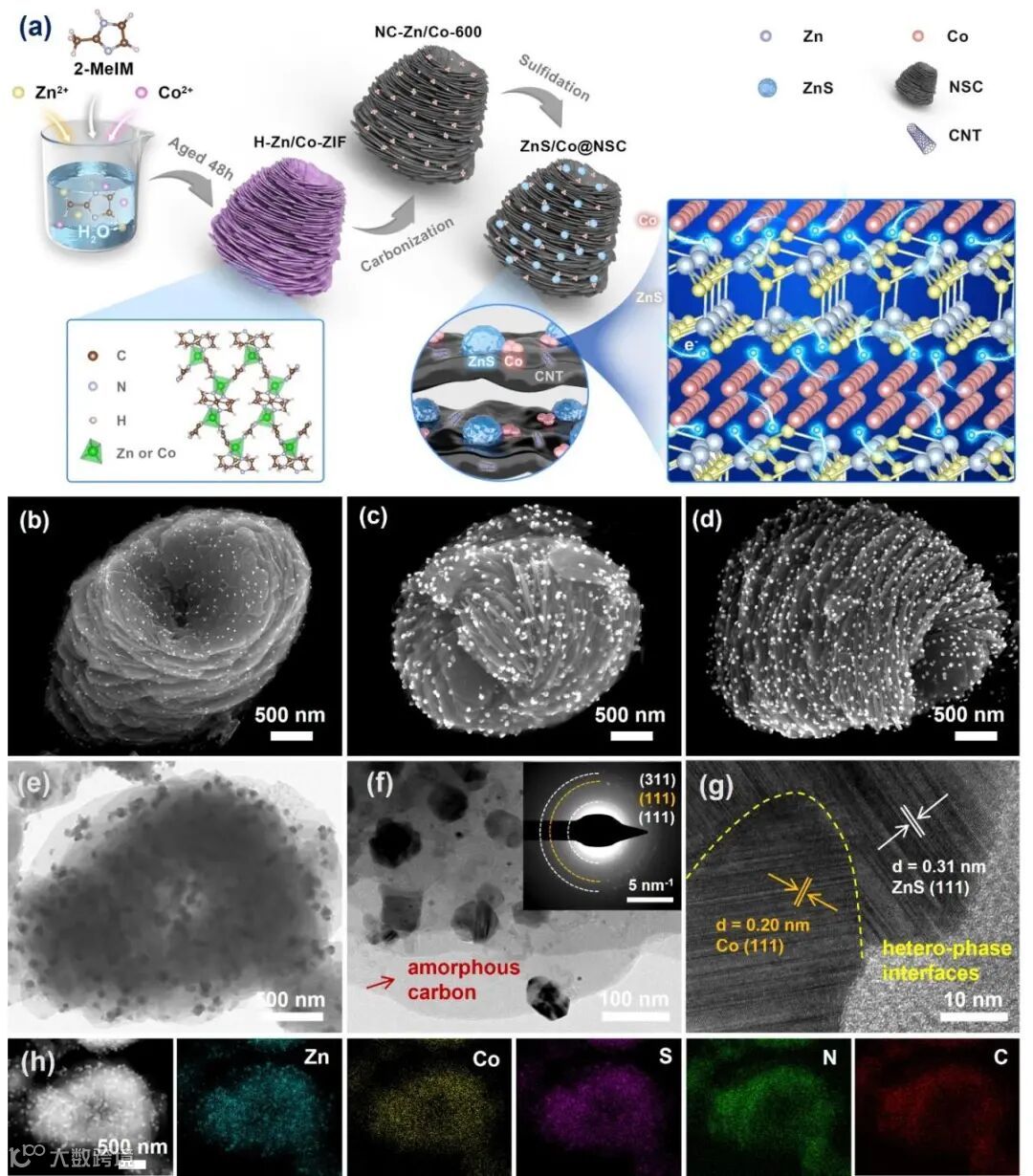以ZIF-8和ZIF-67独特的同构结构为启发,设计并合成了一种新型双金属ZIF(H-Zn/Co-ZIF),并将其作为前驱体制备目标材料。与ZIF-8和ZIF-67的典型十二面体形态不同,H-Zn/Co-ZIF具有由大量纳米板自组装形成的“松果”状结构,其中Zn和Co元素均匀分布。对H-Zn/Co-ZIF进行碳化和硫化处理后,被包裹在“松果”状N/S共掺杂导电碳基质中的ZnS/Co异质结构被成功构建。