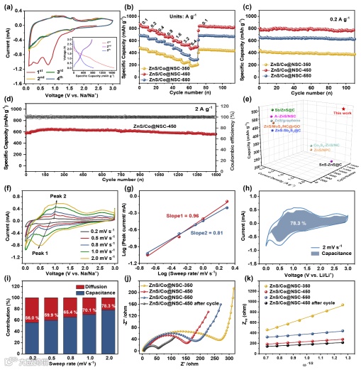图3. SIBs的电化学性能。(a) ZnS/Co@NSC-450的CV曲线(插入图为充放电电压曲线)。(b) 三个ZnS/Co@NSC电极在0.1-6.4 A g-1下的倍率性能。(c) 三个ZnS/Co@NSC电极在0.2 A g-1下的循环性能。(d) ZnS/Co@NSC-450在2 A g-1下的长循环性能。(e) ZnS/Co@NSC-450与其他报道的ZnS基材料的循环性能比较。(f) ZnS/Co@nSC-450在不同扫描速率下的CV曲线。(g) Log (i)与log (v)图。(h) ZnS/Co@NSC-450在2 mV-1时的电容贡献。(i) ZnS/Co@NSC-450在不同扫描速率下的电容贡献比。三个ZnS/Co@NSC新电极和ZnS/Co@NSC-450电极经过循环后的 (j) Nyquist图和 (k) Zre和ω-1/2之间的关系。