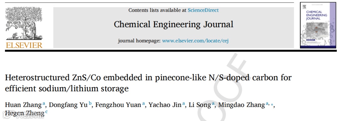 近日,来自南京信息工程大学的张明道教授课题组在国际知名期刊Chemical Engineering Journal上发表题为“Heterostructured ZnS/Co embedded in pinecone-like N/S-doped carbon for efficient sodium/lithium storage”的研究型文章。该文章设计了一种“松果”状N/S共掺杂ZIF衍生碳基质包覆的ZnS/Co异质结结构(ZnS/Co@NSC-450)作为钠离子电池(SIBs)和锂离子电池(LIBs)的优越负极。在最终合成的ZnS/Co@NSC-450中,ZnS纳米颗粒作为活性材料,可以根据离子插层/脱插机制和转化反应为ZnS/Co@NSC-450电极提供高容量。其次,ZnS/Co@NSC-450中微量Co纳米点的存在可以促进ZnS/Co异质结构的构建,利于促进电池的反应动力学,同时抑制ZnS纳米颗粒在长期循环过程中的团聚;最后,在ZnS/Co@NSC-450中N/S共掺杂的“松果”状碳基质的包覆可以有效缓解ZnS在循环过程中的体积膨胀效应,提高材料的整体电导率,且为离子存储提供额外的活性位点。