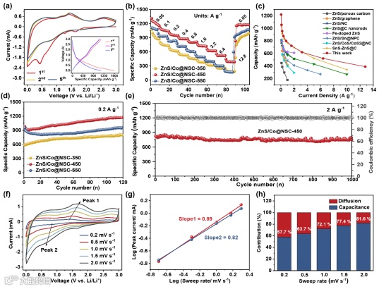 图4. LIBs的电化学性能。(a) ZnS/Co@NSC-450的CV曲线(插入图为充放电电压曲线)。(b) 在0.05 -12.8 A g-1下,三个ZnS/Co@NSC电极的倍率性能。(c) ZnS/Co@NSC-450与其他报道的ZnS基材料的倍率性能的比较。(d) 三个ZnS/Co@NSC电极在0.2 A g-1下的循环性能。(e) ZnS/Co@NSC-450在2 A g-1下的长循环性能。(f) ZnS/Co@NSC-450在0.2、0.5、1.0、1.5和2.0 mV-1时的CV曲线。(g) Log (i)与log (v)图。(h) ZnS/Co@NSC-450在不同扫描速率下的电容贡献比。