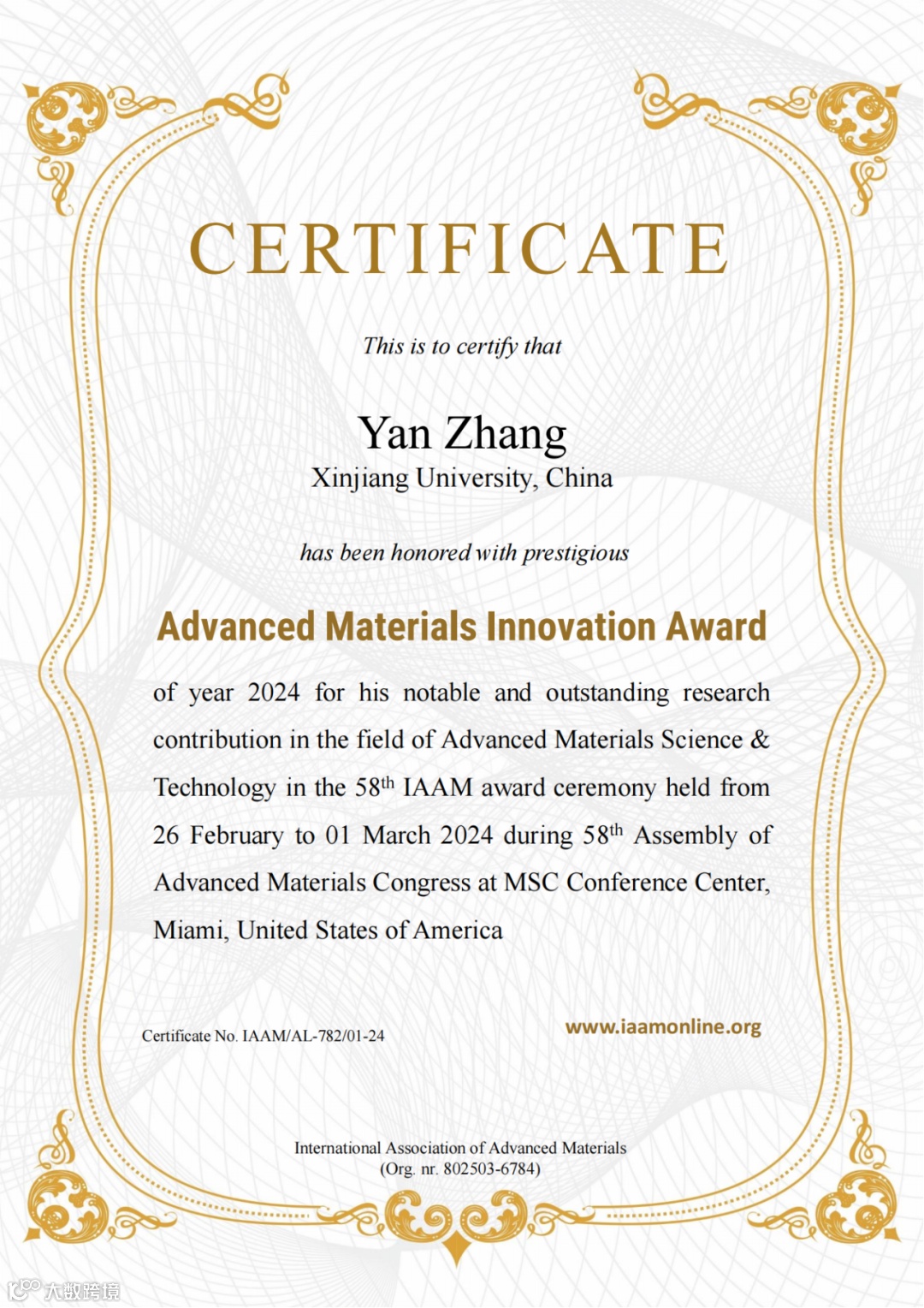 近日,在美国迈阿密MSC会议中心举行的第58届先进材料大会上,张岩副教授荣获国际先进材料学会颁发的先进材料创新奖(Advanced Materials innovation Award),以表彰其在先进材料科学与技术领域所取得的突出成就。