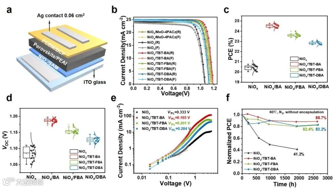 基于TBT-BA修饰的NiOx的反式器件实现了24.8%的最高PCE。该器件还表现出优异的热稳定性,在氮气手套箱中60°C下保存2635小时后,保持了88.7%的初始PCE。