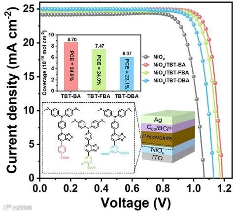 图1. 将SAMs修饰的氧化镍用作反式钙钛矿太阳能电池的空穴选择层,由于TBT-BA在NiOx上的覆盖率最高,最终获得了24.8%的PCE以及优异的热稳定性。